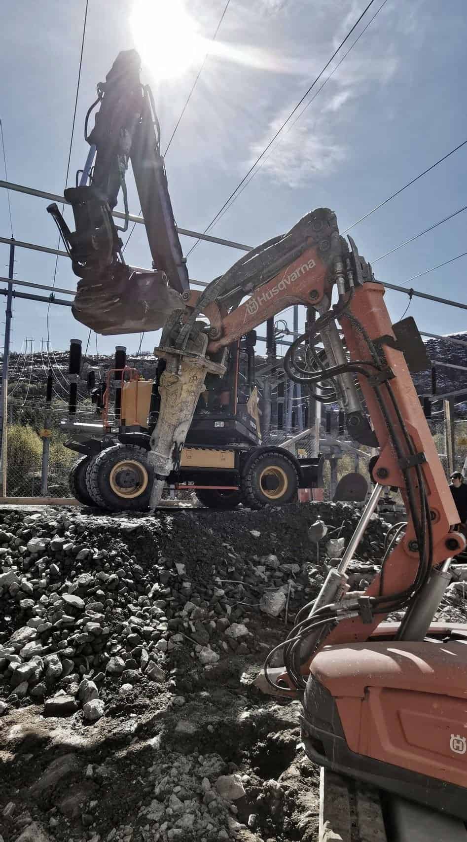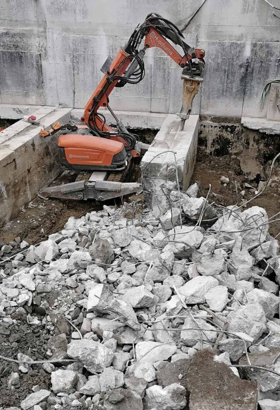 Vi benytter en kraftig rivingsrobot fra Husqvarna som effektivt meisler bort betong og andre materialer med presisjon og høy sikkerhet.